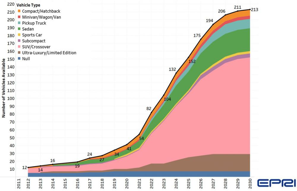 The EV industry is steadily growing. We are tracking the availability of vehicle types and expecting the industry to grow further. By 2024, more than 130 models are projected to be available for US consumers. This is a vast improvement from the year 2010 in which only 2 models were available.
